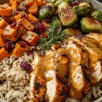 Now for the fun part! Grab your serving bowls and start assembling. Begin by dividing the fluffy rice among the bowls. Place the juicy sliced chicken on top, surrounded by your beautifully roasted sweet potatoes and Brussels sprouts.