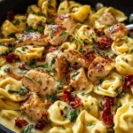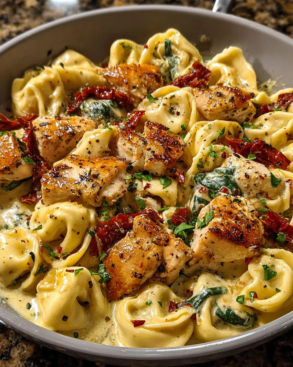 A comforting and creamy dish featuring tender chicken, cheese tortellini, and sun-dried tomatoes in a rich sauce.