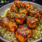 Serve a generous scoop of lemon-infused rice on each plate, topping it with the grilled salmon cubes.