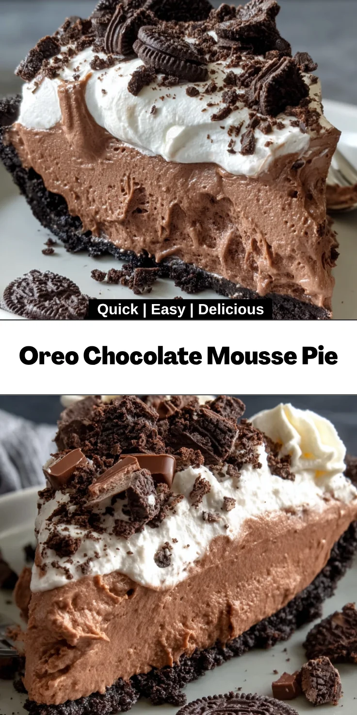 A rich and creamy Oreo Chocolate Mousse Pie that combines chocolate pudding with crushed Oreo cookies for a decadent dessert experience.