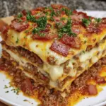 A delicious twist on classic lasagna, featuring layers of ground beef, crispy bacon, and a creamy Parmesan garlic béchamel sauce.