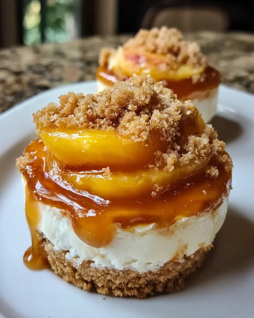 A delicious twist on classic peach cobbler, these cheesecakes feature a creamy filling, a crunchy crust, and a sweet peach center, topped with a crumble and caramel for an indulgent dessert.