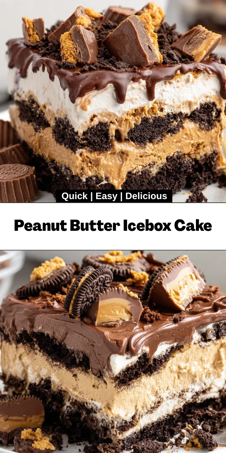 Peanut Butter Icebox Cake is a no-bake dessert that layers creamy peanut butter and chocolate pudding with crunchy chocolate sandwich cookies and Reese’s peanut butter cups.