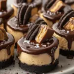 Peanut Butter Oreo Cheesecake Bites are a delicious and easy-to-make dessert featuring a creamy peanut butter cheesecake filling on an Oreo crust, topped with a rich dark chocolate ganache.