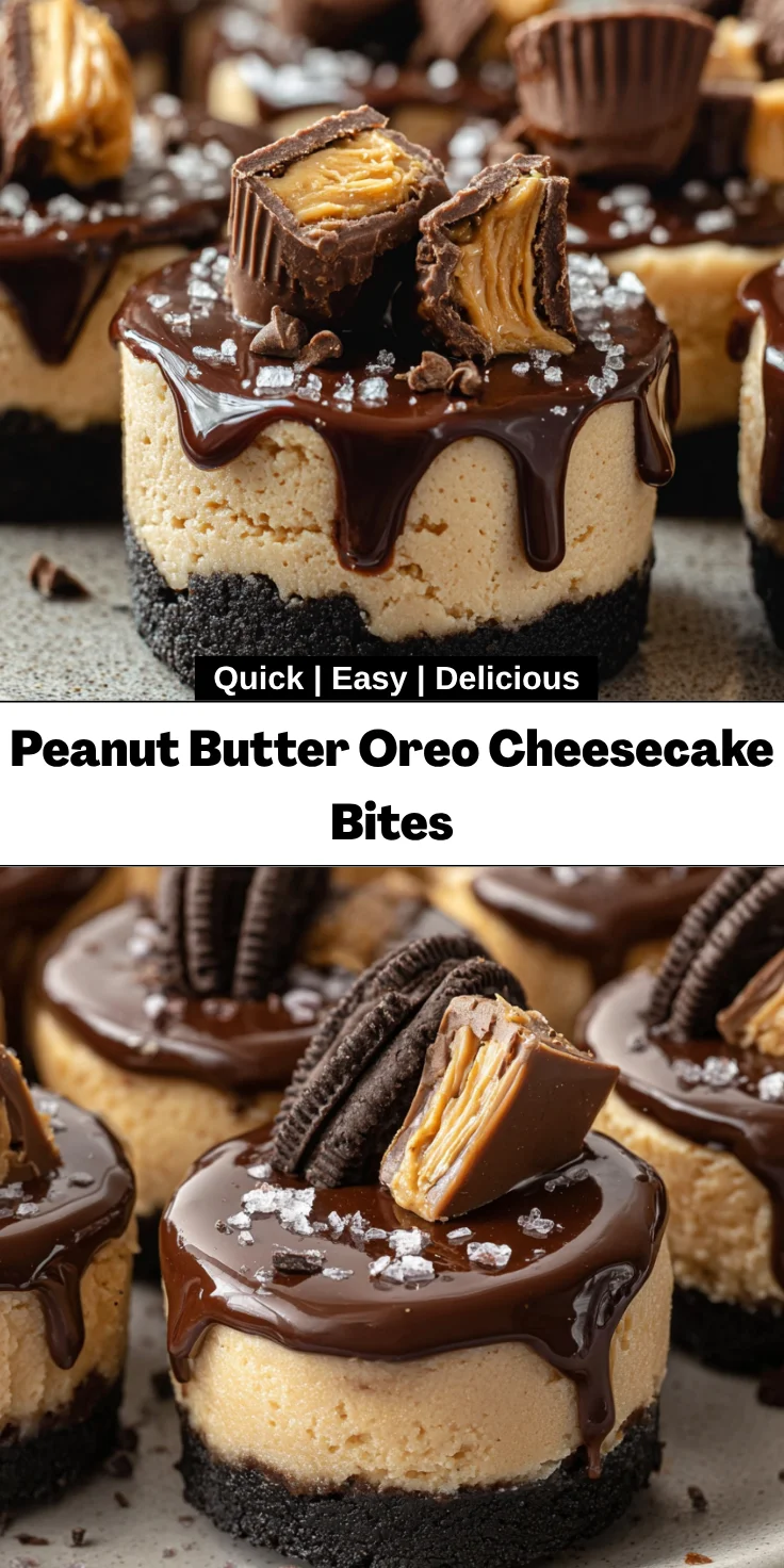 Peanut Butter Oreo Cheesecake Bites are a delicious and easy-to-make dessert featuring a creamy peanut butter cheesecake filling on an Oreo crust, topped with a rich dark chocolate ganache.