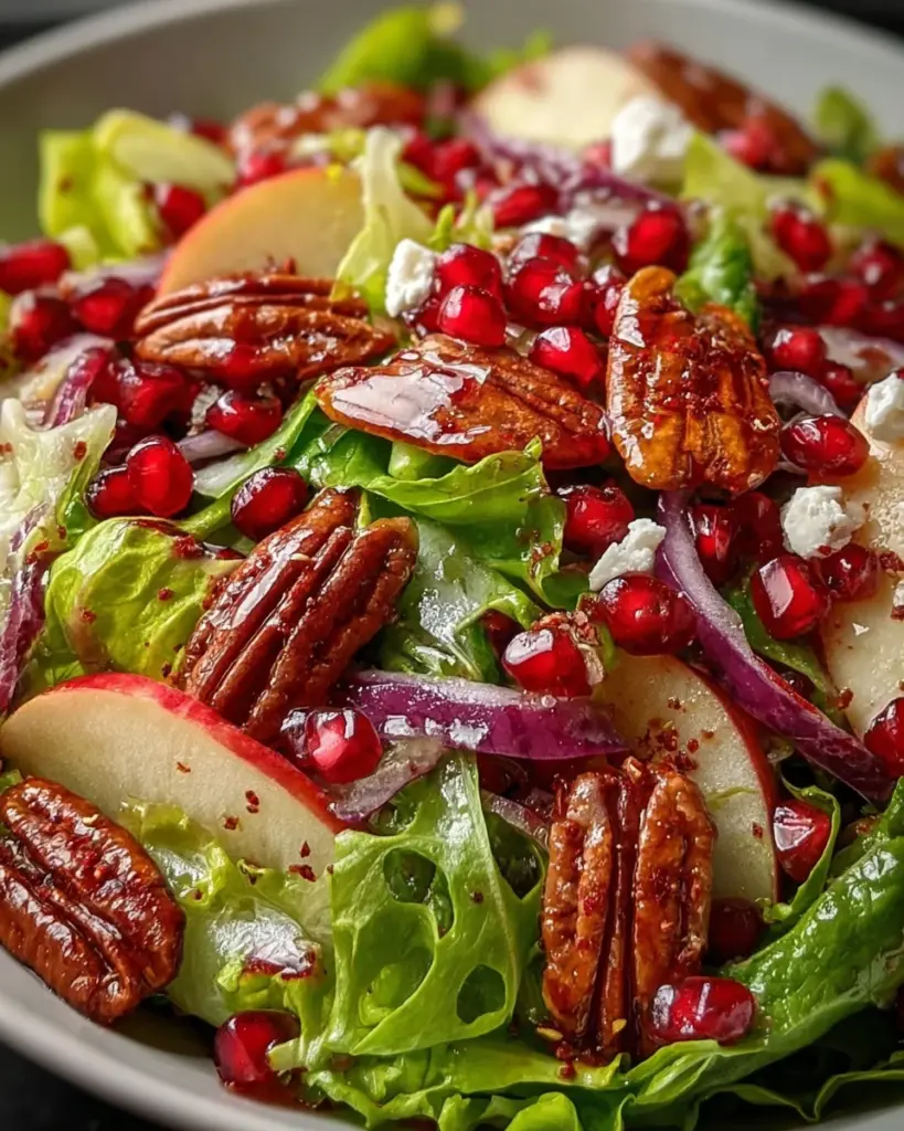 A refreshing and delightful salad featuring mixed greens, pomegranate seeds, and toasted pecans, topped with a tangy vinaigrette.