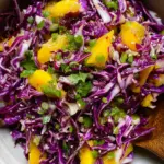 A refreshing and vibrant slaw combining purple cabbage, mango, and cranberries, perfect as a side dish or light meal.