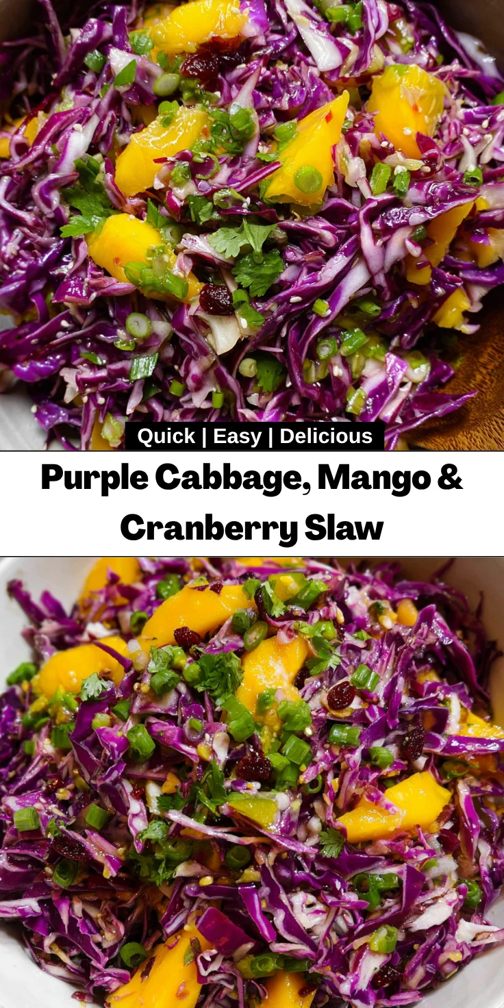 A refreshing and vibrant slaw combining purple cabbage, mango, and cranberries, perfect as a side dish or light meal.