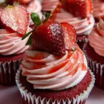 Delicious red velvet cupcakes topped with pink buttercream frosting and fresh strawberries.