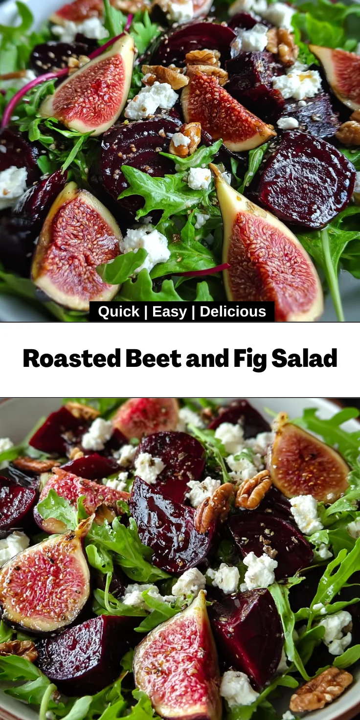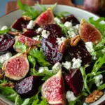 A delicious and unique salad featuring roasted beets, fresh figs, and creamy feta cheese on a bed of arugula, dressed with balsamic vinaigrette.