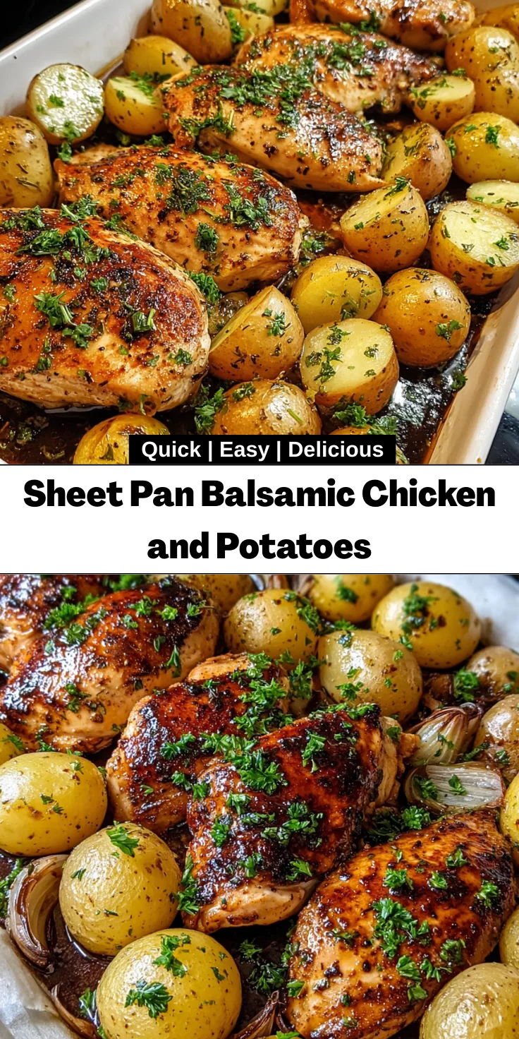A delicious and easy-to-make sheet pan meal featuring balsamic chicken and roasted baby potatoes.