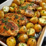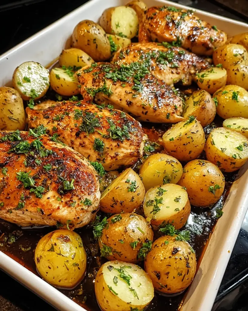 - Bake 25–30 minutes, until chicken reaches 165°F (74°C) and potatoes are tender and golden.