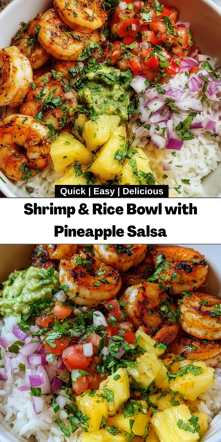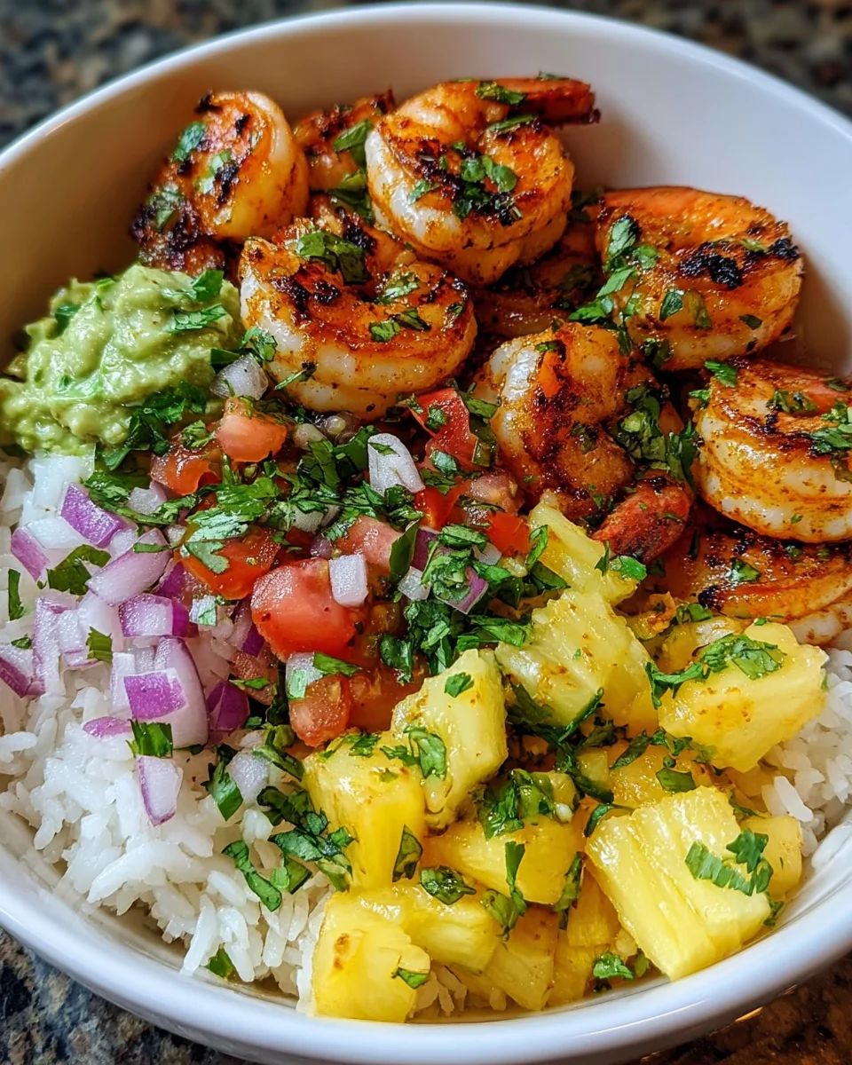 A flavorful and vibrant Shrimp & Rice Bowl topped with fresh Pineapple Salsa and optional creamy Avocado Crema that is perfect for a delightful meal.