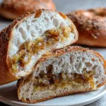 While the bagels are still damp from boiling, take your sautéed onions and press them firmly onto the surface of each bagel. Don’t be shy—the more, the merrier! Preheat your oven to 425°F and bake them for 20-25 minutes. Keep an eye out for that rustic, golden-brown color. Each bagel should have a beautiful crust, promising a crunchy exterior that gives way to a chewy bite.
