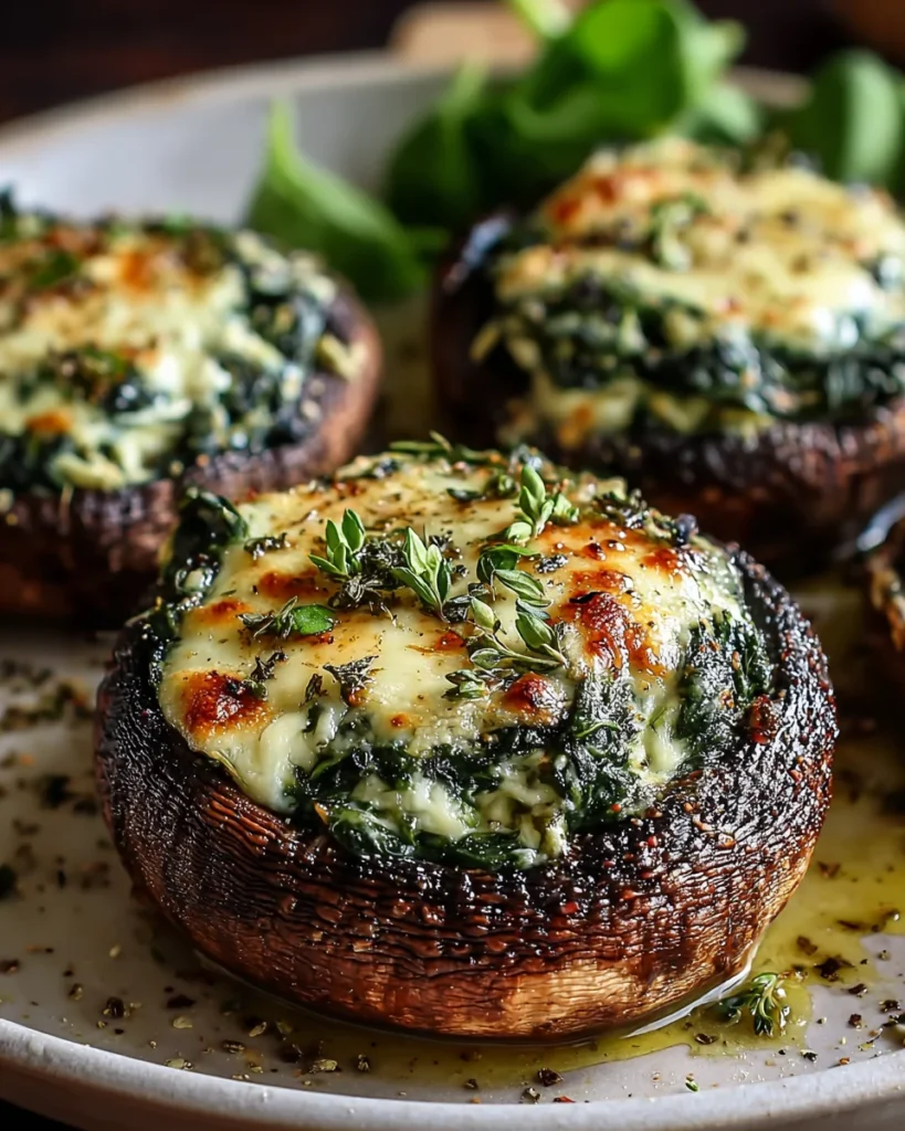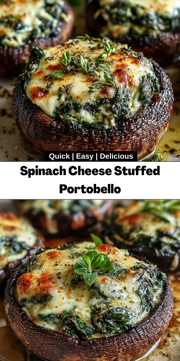 A delicious and hearty dish featuring large portobello mushrooms stuffed with a flavorful mixture of spinach and various cheeses.
