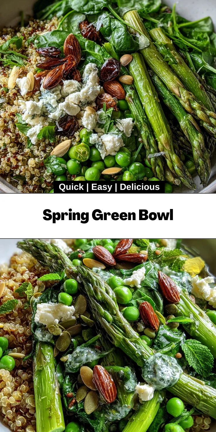 A light and nutritious Spring Green Bowl packed with quinoa and fresh green vegetables, topped with a zesty lemon dressing.