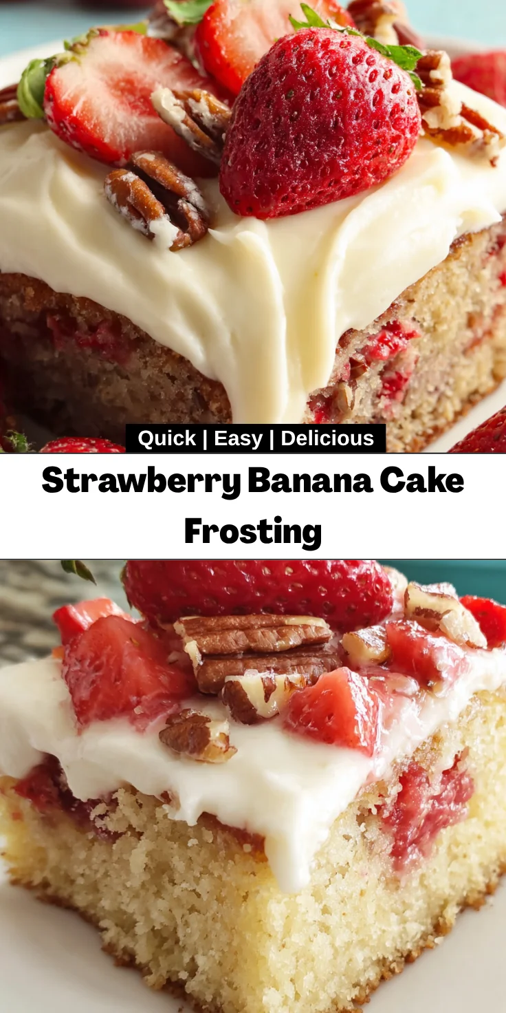 A deliciously moist cake made with ripe bananas and fresh strawberries, topped with a creamy cream cheese buttercream frosting.