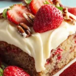Once baked, allow your cake to cool completely in the dish. For the frosting, beat together the softened butter, cream cheese, and powdered sugar until smooth and creamy. Spread this heavenly frosting over the cooled cake. Top it off with the remaining pecans and diced strawberries for a stunning finish!
