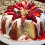 Once your cake is golden and baked to perfection, cool it in the pan for about 15 minutes. Then, invert it onto a wire rack and let it cool completely—around 30 minutes. While the cake cools, let’s whip up the glaze! Beat the softened cream cheese until smooth, then add the powdered sugar, strawberry puree, vanilla, and a splash of milk. Mix until thick and glossy. Drizzle generously over the fully cooled cake and marvel at the beauty!