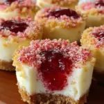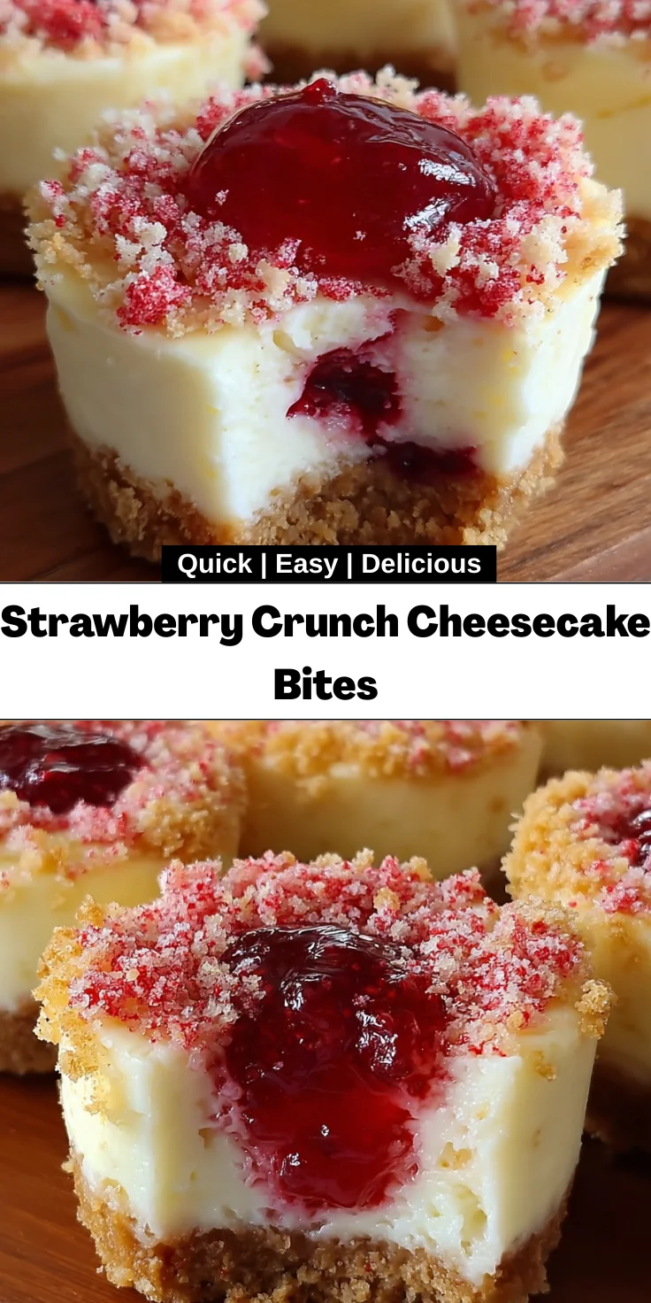 Strawberry Crunch Cheesecake Bites are a delightful treat combining a crispy crust, creamy cheesecake filling, and a fruity strawberry center, topped with a crunchy strawberry mix.
