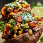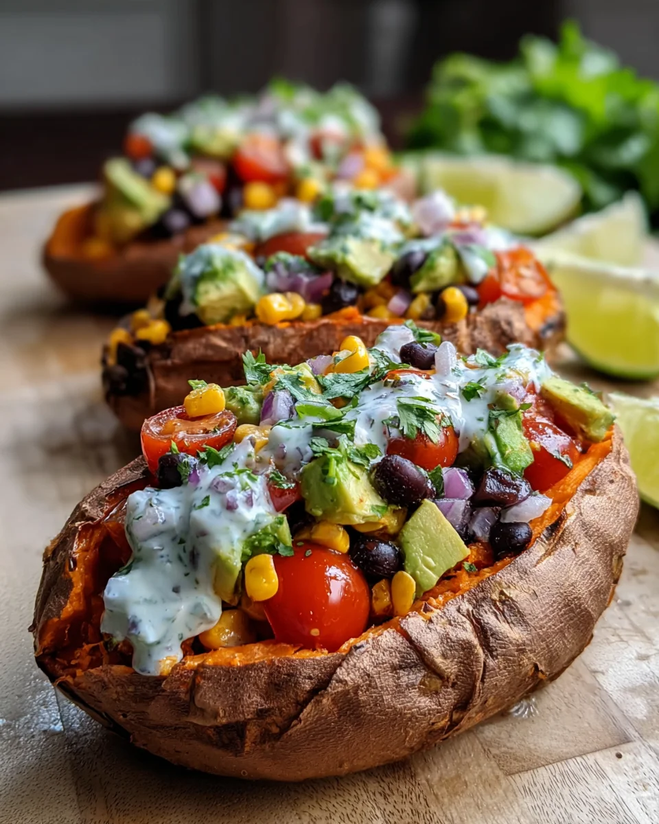 A nutritious and satisfying meal featuring sweet potatoes stuffed with black beans, avocado, and topped with a cilantro lime crema.