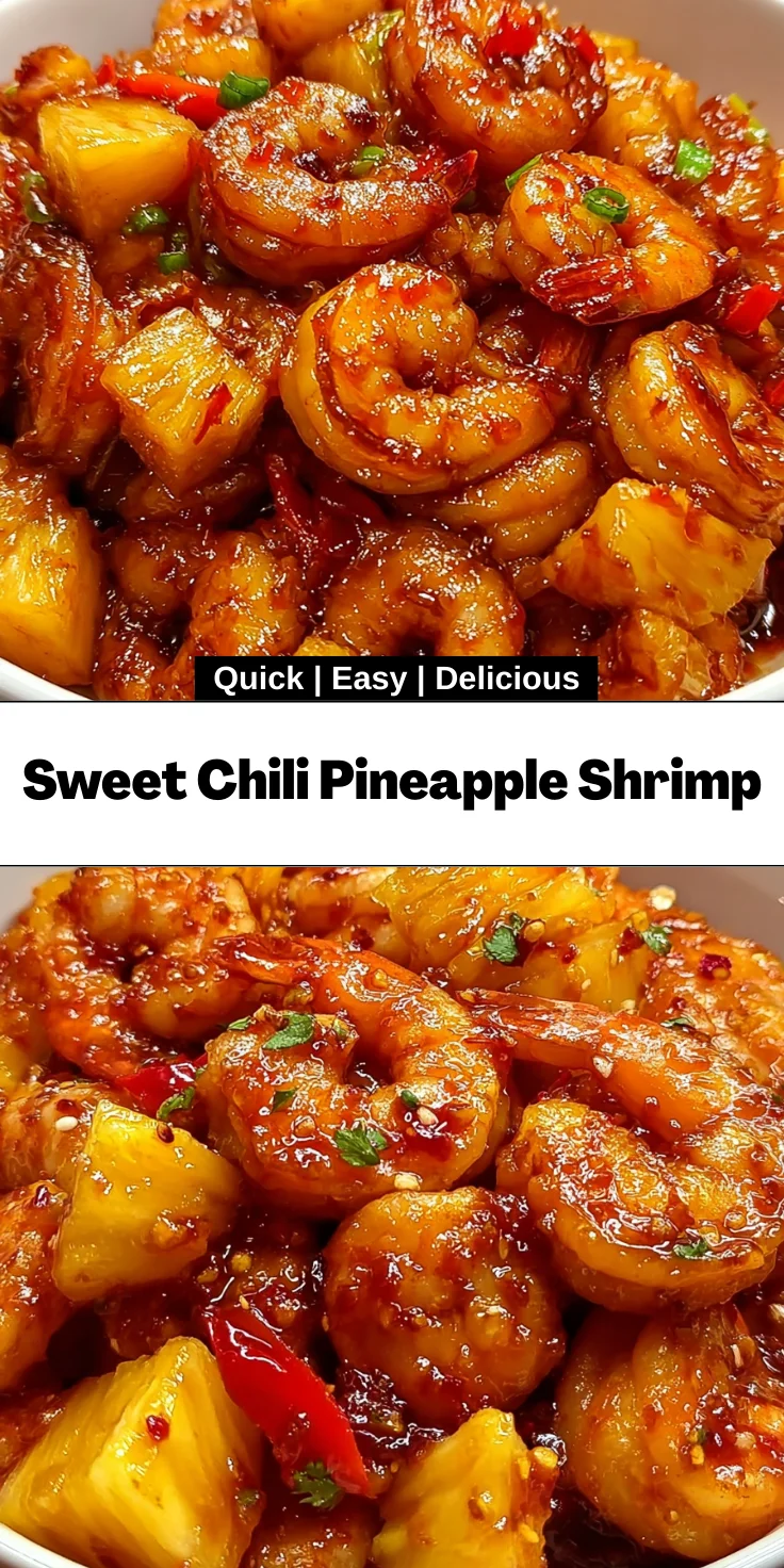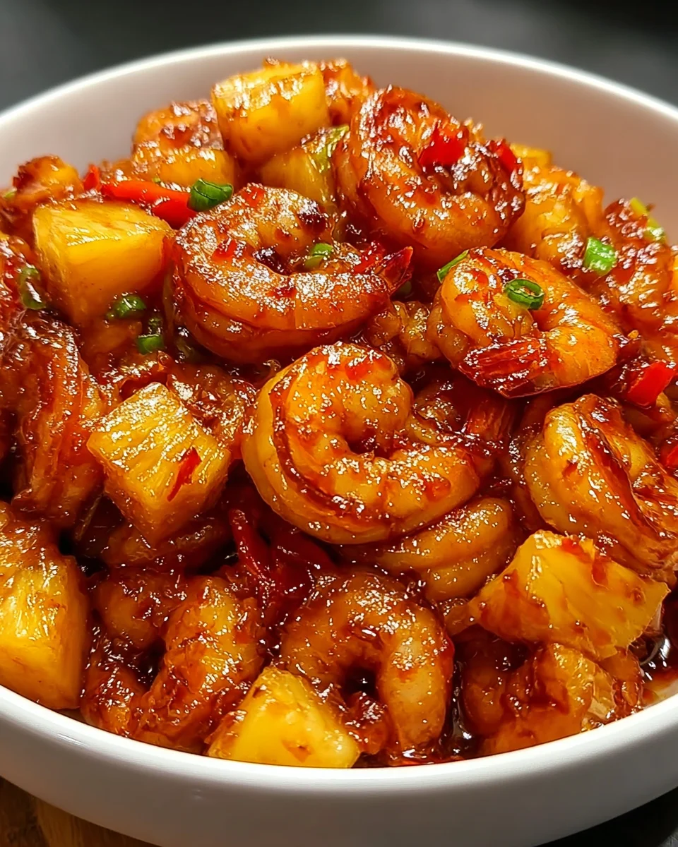 A delicious and vibrant dish featuring shrimp marinated in sweet chili sauce and combined with fresh pineapple for a delightful flavor experience.