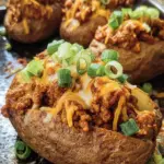 Place the seasoned potatoes directly onto the oven rack, almost like they’re comfy on their little beds! Bake them for about 30 minutes. After that, flip them and return them to cook for another 20 to 30 minutes. You want the potatoes to be fork-tender. A sharp knife should easily pierce through their fluffy goodness. Once they’re perfect, carefully remove them from the oven and let them cool just enough to handle. They’ll be puffed up and ready for a hearty filling!