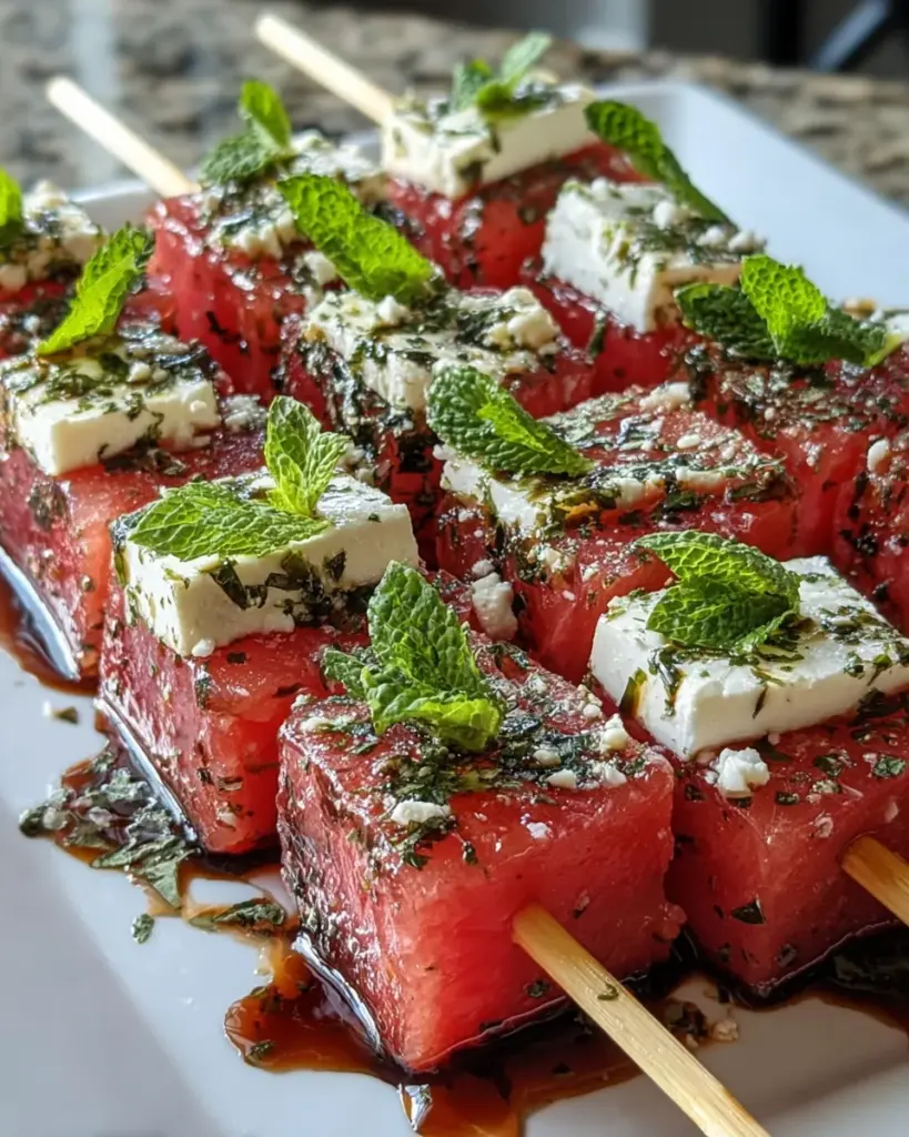 A refreshing and delightful appetizer combining sweet watermelon, savory feta cheese, and fresh mint.