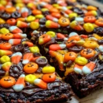 A fun and festive Halloween treat that combines rich brownie flavors with colorful candy toppings, perfect for spooking your guests.
